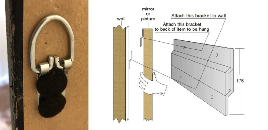 Mirror glass is heavy, so we want to make sure that weight is distributed evenly to avoid damaging your wall. Depending on your mirror’s size, we will either install 3-hole “D-rings,” or a Z Bar “French cleat,” examples shown above.