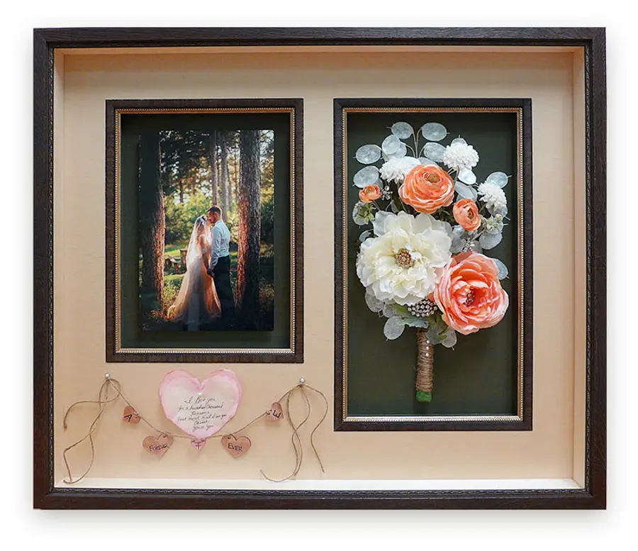 - Frame your wedding dress, Ketubah, bouquets and other large items for incredible wall decor that also preserves these cherished pieces.
