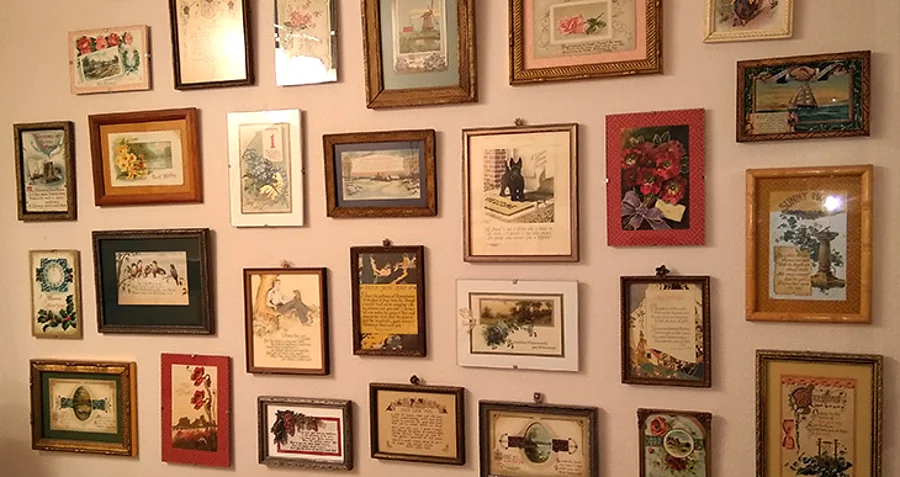 For an instant “collection,” choose art of the same type. This could be all vintage greeting cards like those shown above, all photographs, or all musical objects – the options are nearly limitless.