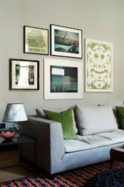 Color can be intimidating, but you really only have to focus on one. In the living room shown on the left, the art all shares a similar shade of green, which is then also brought out with other decor items like the pillows.